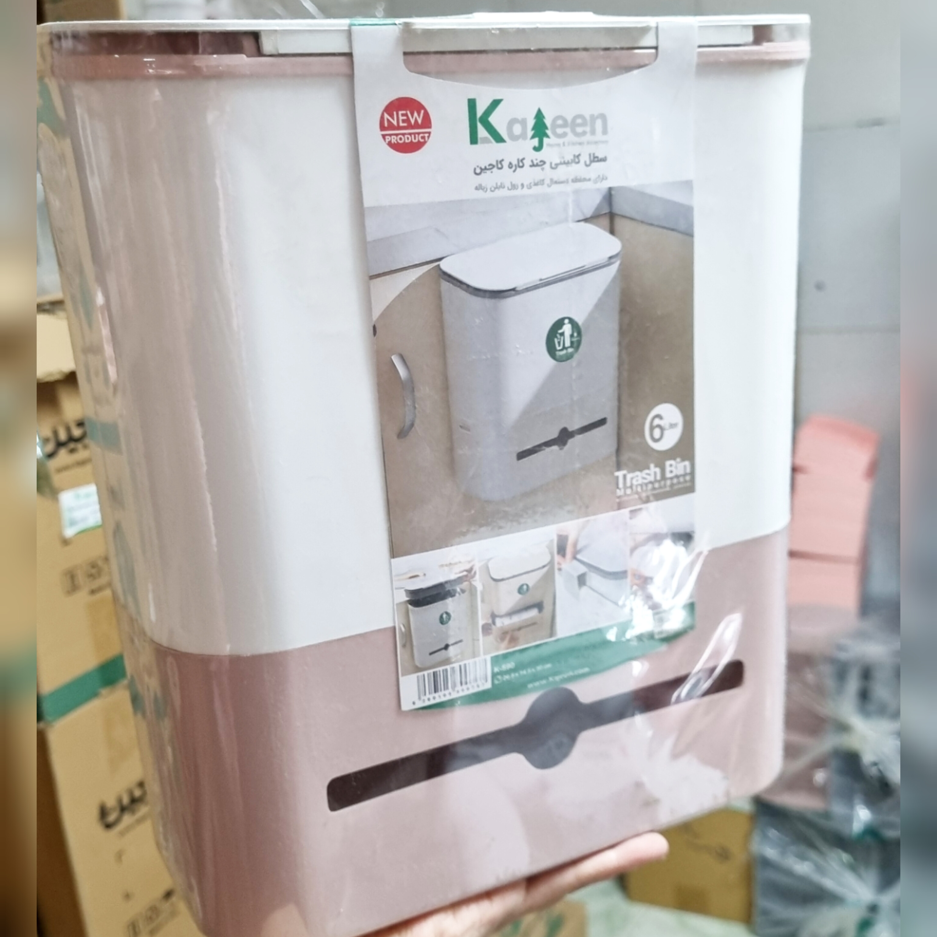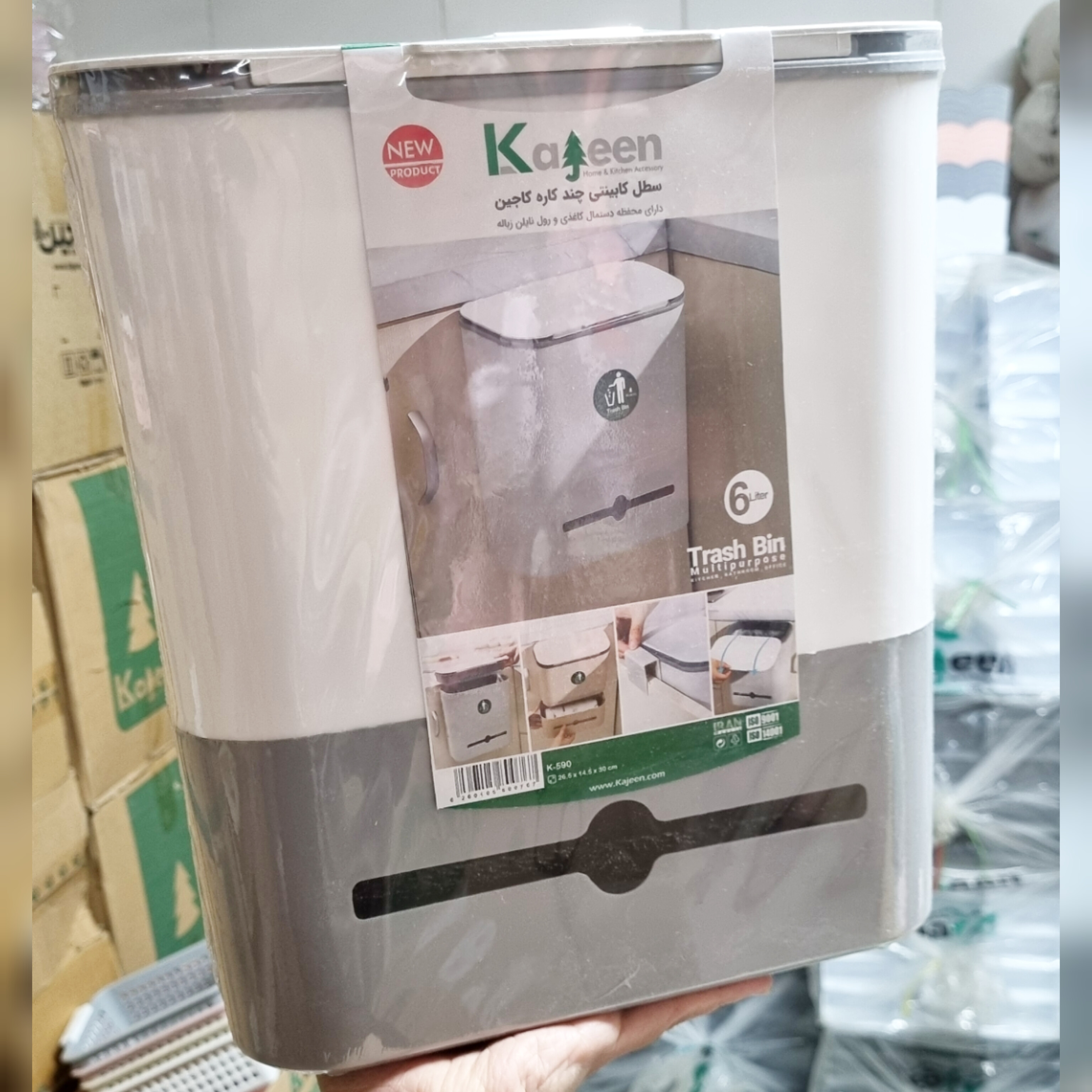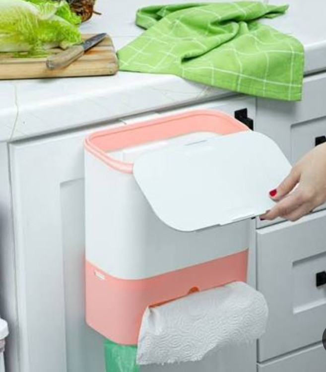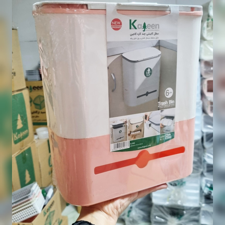 سطل کابینتی چند منظوره کاجین جنس پلاستیک با گنجایش 6 لیتر مناسب استفاده در آشپزخانه و حمام و سرویس بهداشتی و سالن ادای و.. با قابلیت نصب آسان و درب کشابی دارای جای کیسه زباله و دستمال رولی و مخزن سطل زباله میباشد