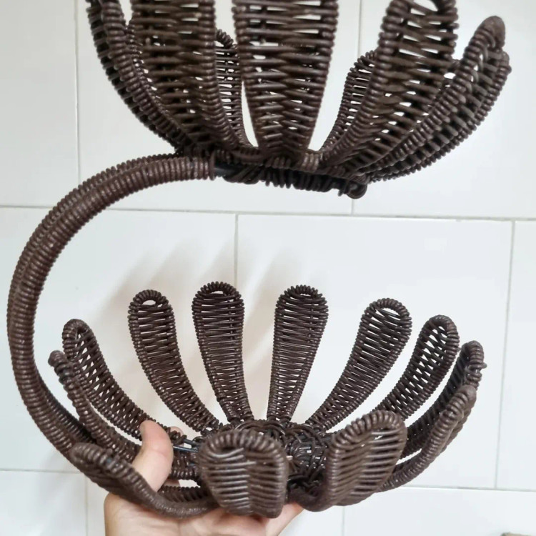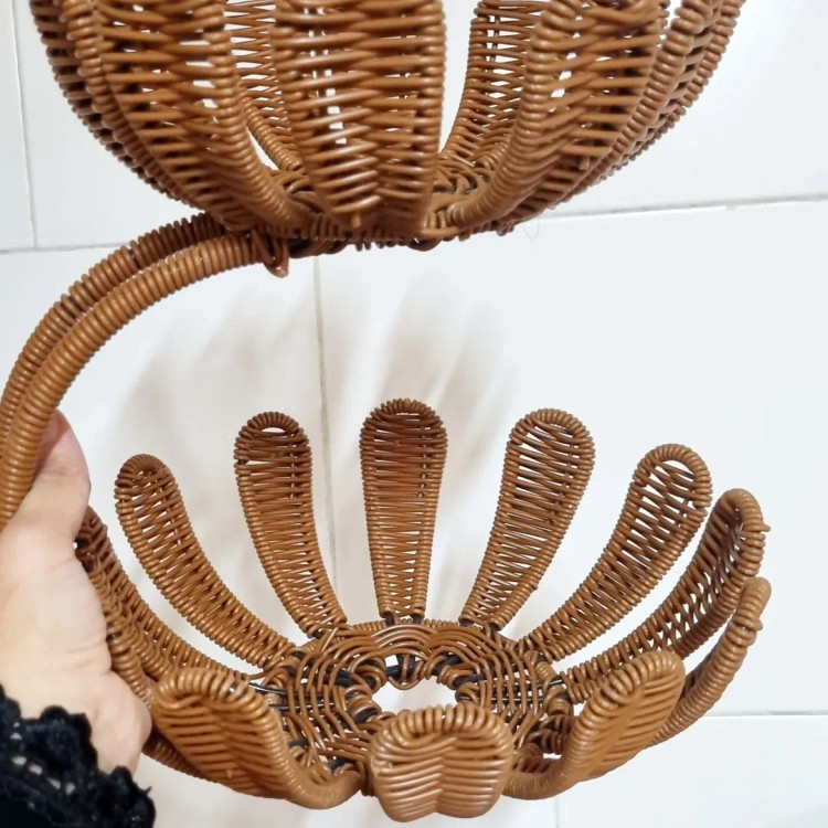 ظرف میوه دو طبقه کاری شیک از پلاستیک و فلز با بافت حصیری قابل شستشو مناسب چیدمان میز پذیرایی و مناسبتها برای شب یلدا و هفت سین و حتی چیدمان سفره عقد. محصوا نو میباشد و در فروشگاه است